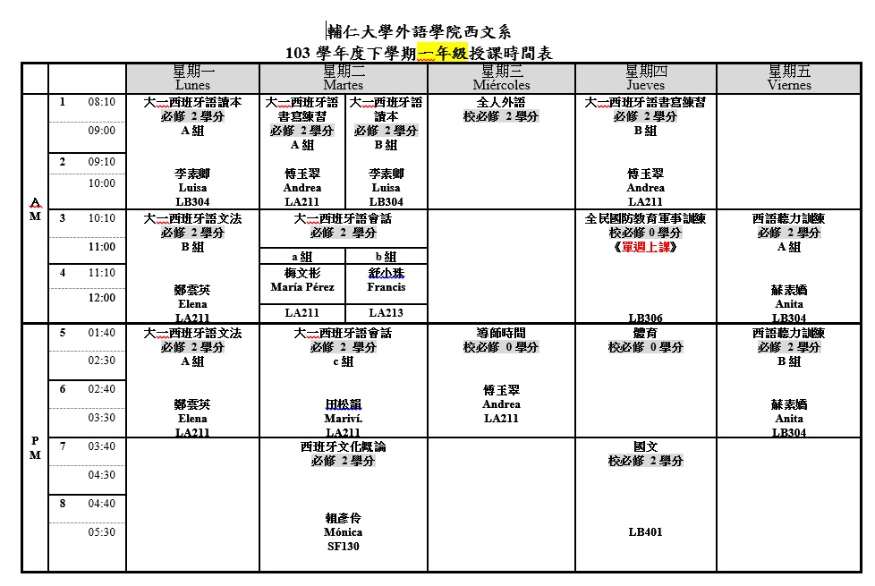 114學年度第一學期全年級課表 114學年度第二學期全年級課表