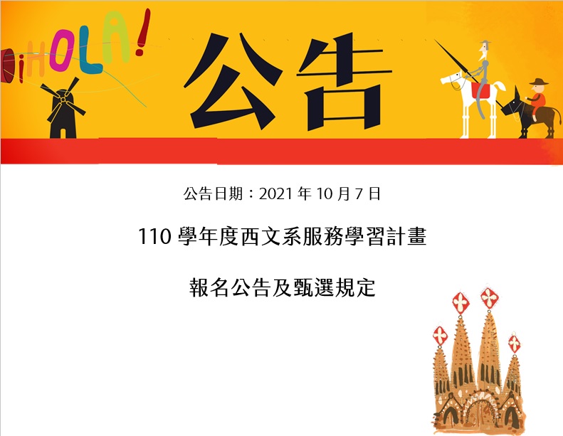 2021/10/07 14:09 [系所行政公告]110學年度西文系服務學習計畫報名公告及甄選規定