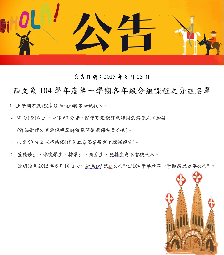 2015/08/25 10:48 [系所課務公告]西文系104學年度第一學期各年級分組上課科目之分組名單