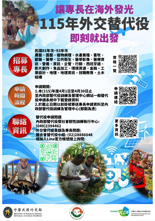 財團法人國際合作發展基金會規劃辦理「115年度外交替代役線上說明會」,